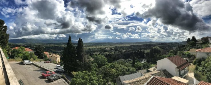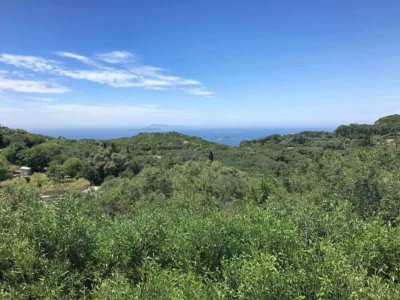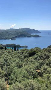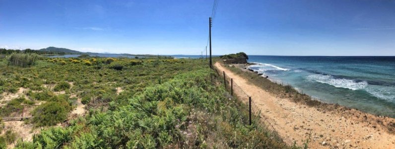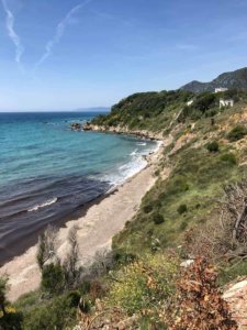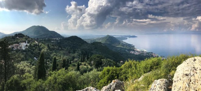 Corfu-Trail - km 83 - In der Ferne ist die Bucht von Glifada erkennbar. Ermones liegt hinter dem Bergrücken
