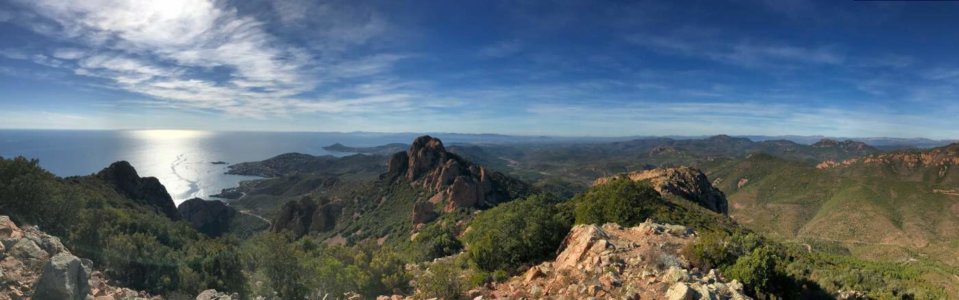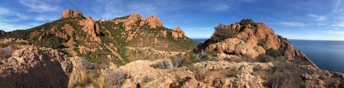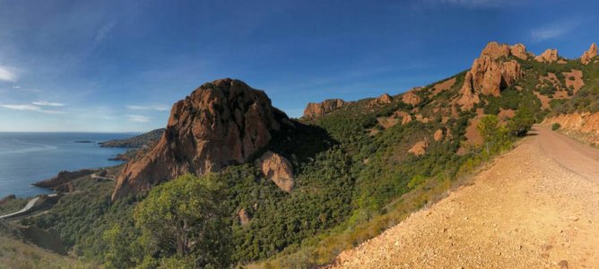 Vom Bahnhof aus geht es über Treppen zur höher gelegen Straße und von dort nach ein paar Kurven relativ schnell in die Natur. Nach ca. 5km erreichen wir den Pic du Cap Roux (454m), den bei Wanderern wohl beliebtesten Gipfel des Massiv de l'Esterel. Die markanten, roten Felsen des Bergmassivs sind eben an keiner anderen Stelle so nah am Meer und damit so beeindruckend.