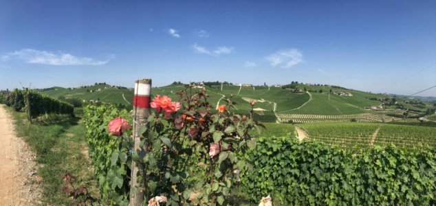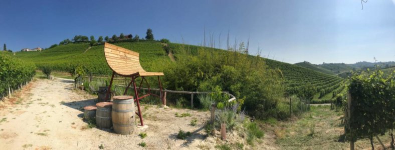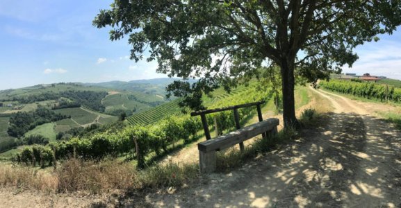 Der Wanderweg führt durch die Weinberge des Barbaresco-Anbaugebiets, zunächst hinab ins Tal zu einer stillgelegten Bahnstrecke und anschließend auf der gegenüberliegenden Hügelseite wieder bergauf. Mehrmals treffen wir dabei auf überdimensionale Holzbänke, einer Idee des Big-Bench-Community-Projekts (siehe Wegpunkt 3).